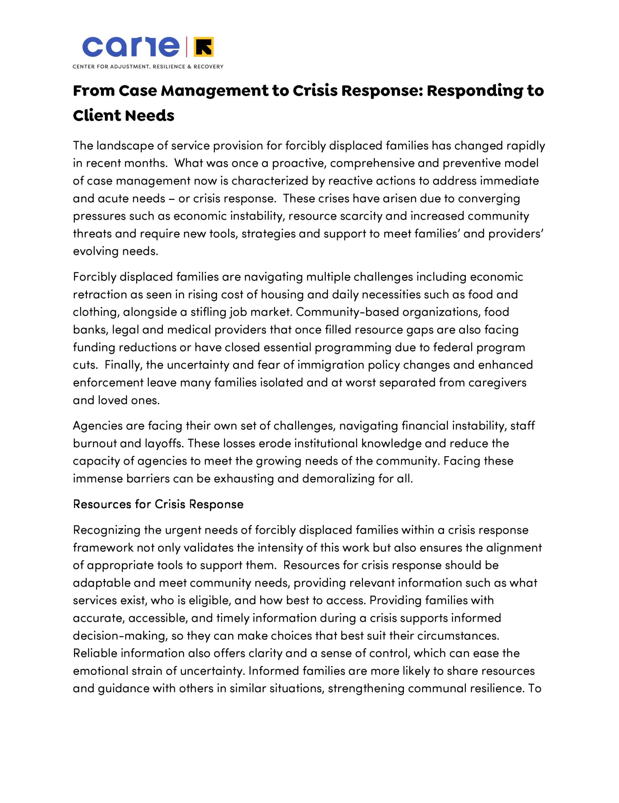 (CARRE Sept 2025 Newsletter) Service providers supporting forcibly displaced families are increasingly operating in a crisis response model due to communities facing multiple challenges including rising economic pressures, resource scarcity, and immigration enforcement threats. This shift requires tools that empower families to make informed decisions. To this aim, CARRE has curated recently published resources for families facing crises including planned and unplanned departures from the United States.