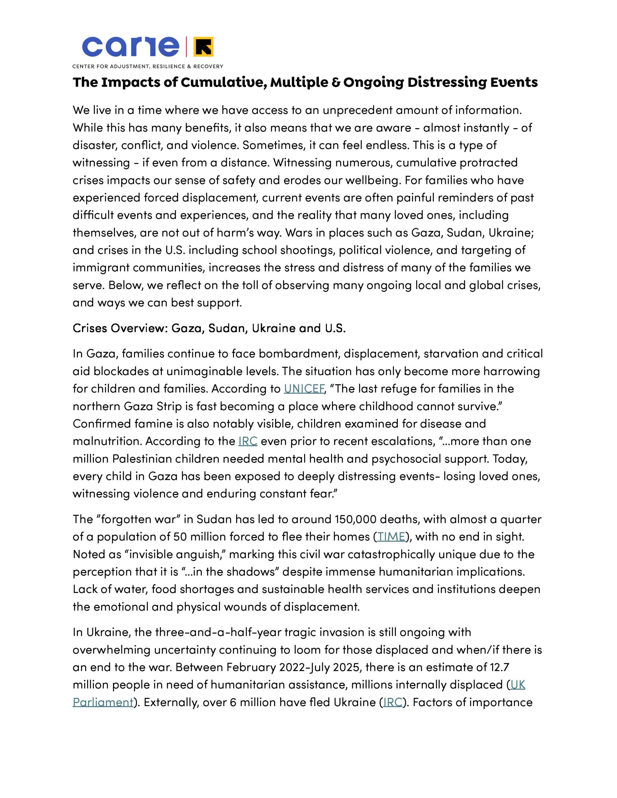 (CARRE Sept 2025 Newsletter) Living in times where we are witnessing and experiencing numerous, simultaneously occurring difficult events, we recognize that this can greatly impact our sense of safety and erode our wellbeing. The article linked below highlights a few of the local and global crises we are collectively processing, the subsequent Mental Health impacts, and ways we can best support one another.