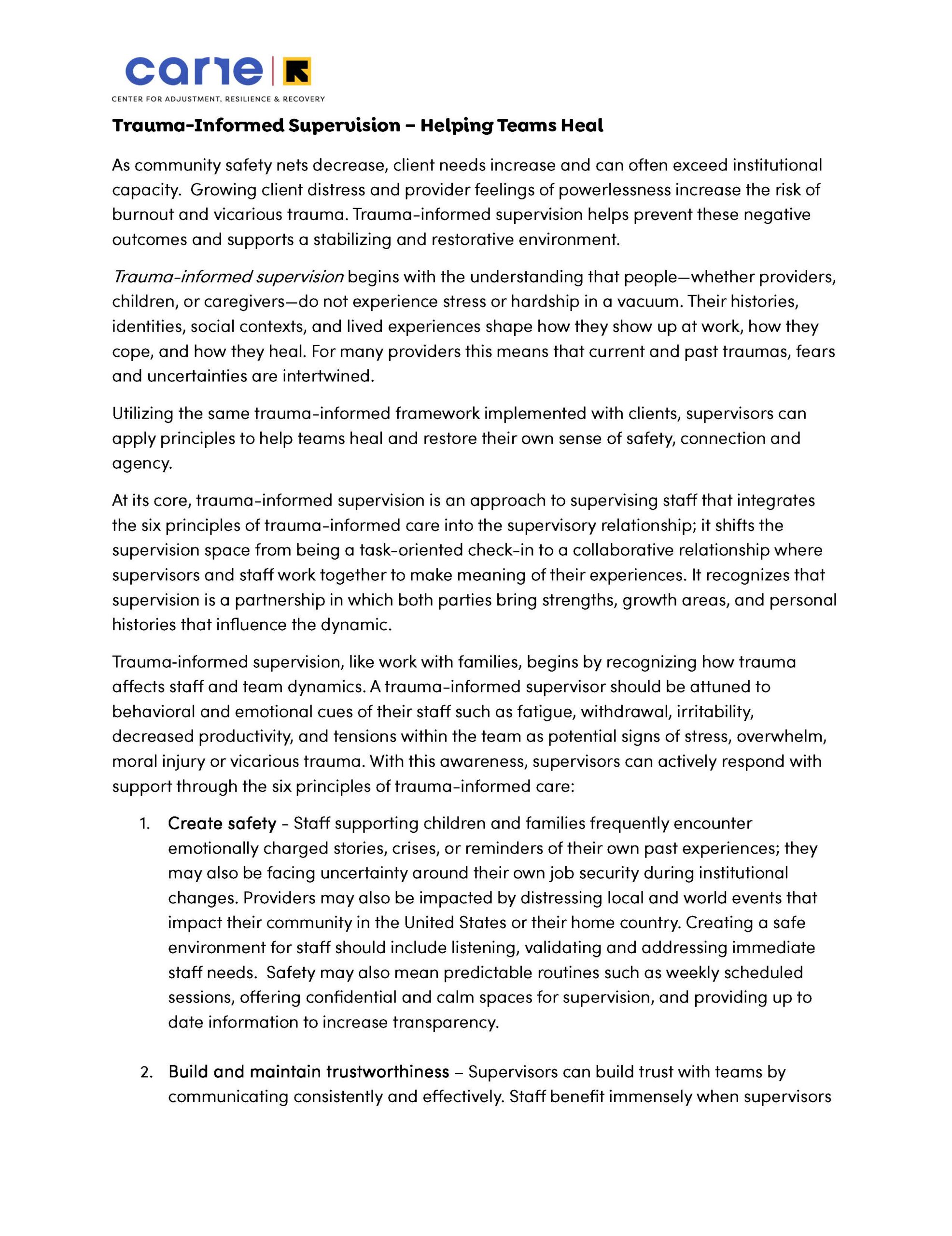This article within the CARRE March 2026 newsletter focuses on the ways supervisors can utilize trauma-informed supervision through the six principles of trauma-informed care to support team healing in creating stabilizing and restorative environments.