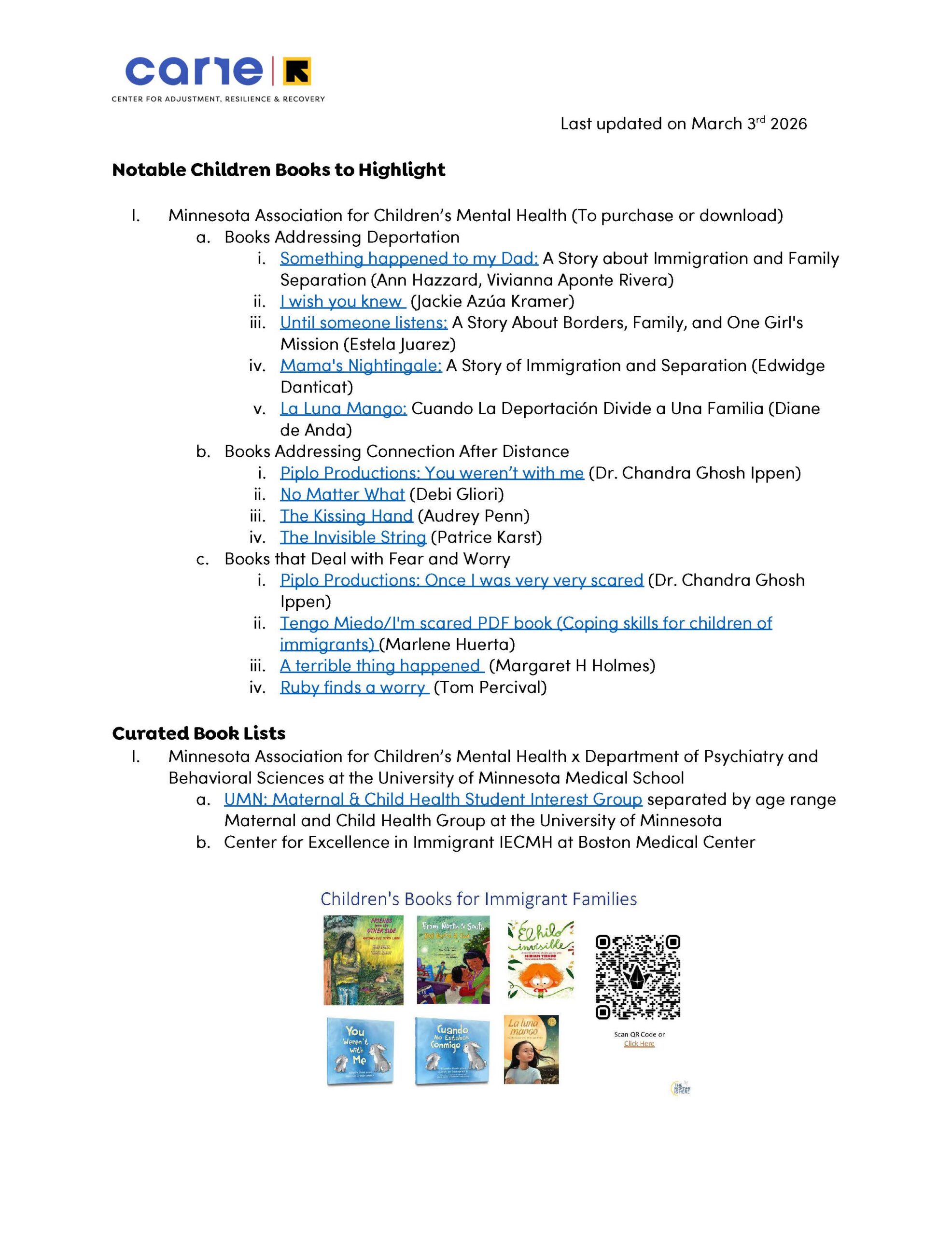 Please find linked BELOW a list capturing various and notable children’s books on topics and themes related to the ongoing uncertainty and distress families continue to navigate. These book titles and lists are drawn from sources such as: The Minnesota Association for Children’s Mental Health, UMN Maternal & Child Health Student Interest Group, Center for Excellence in Immigrant IECMH at BMC, MaiStoryBook, Little Justice Leaders, and The Kidlit Mama. These resources are available for purchase and/or to download. Note: this is a resource that will be continuously updated.
