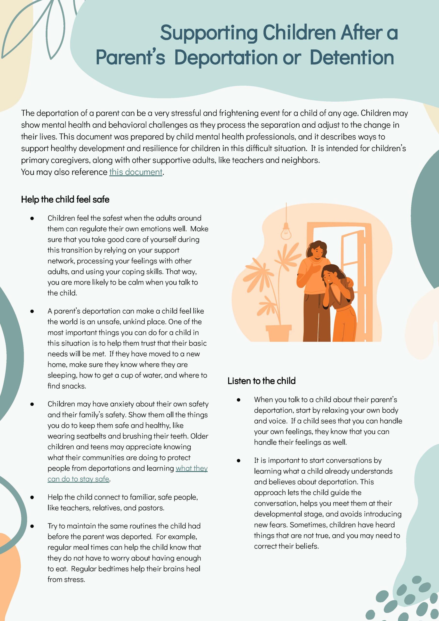 Family separation can be very stressful and frightening for a child of any age. Children may show mental health and behavioral challenges as they process the separation and adjust to the change in their lives. This document was prepared by child mental health professionals associated with the University of Minnesota, and it describes ways to support healthy development and resilience for children in this difficult situation. It is intended for children’s primary caregivers, along with other supportive adults, like teachers and neighbors.